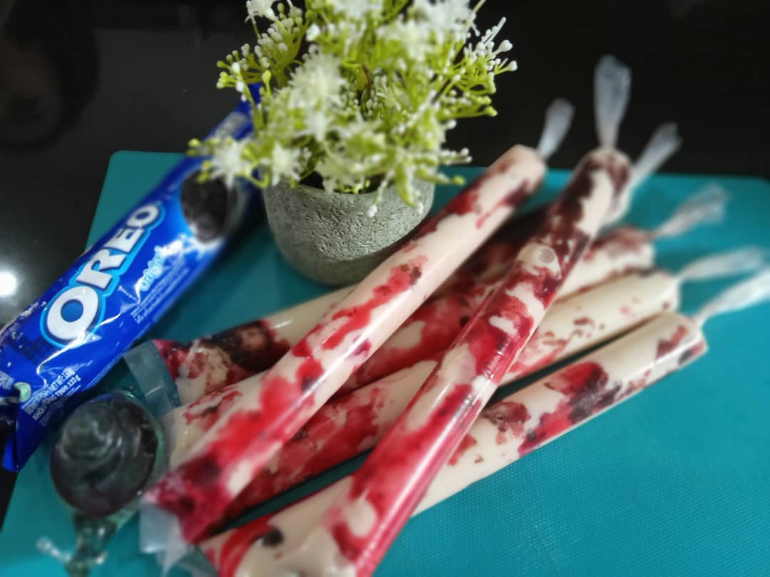 Campuran air, susu, gula perang, oreo & strawberry filling.